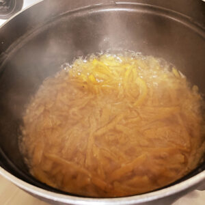 千切りにした皮を、鍋で煮込んであく抜きするワン